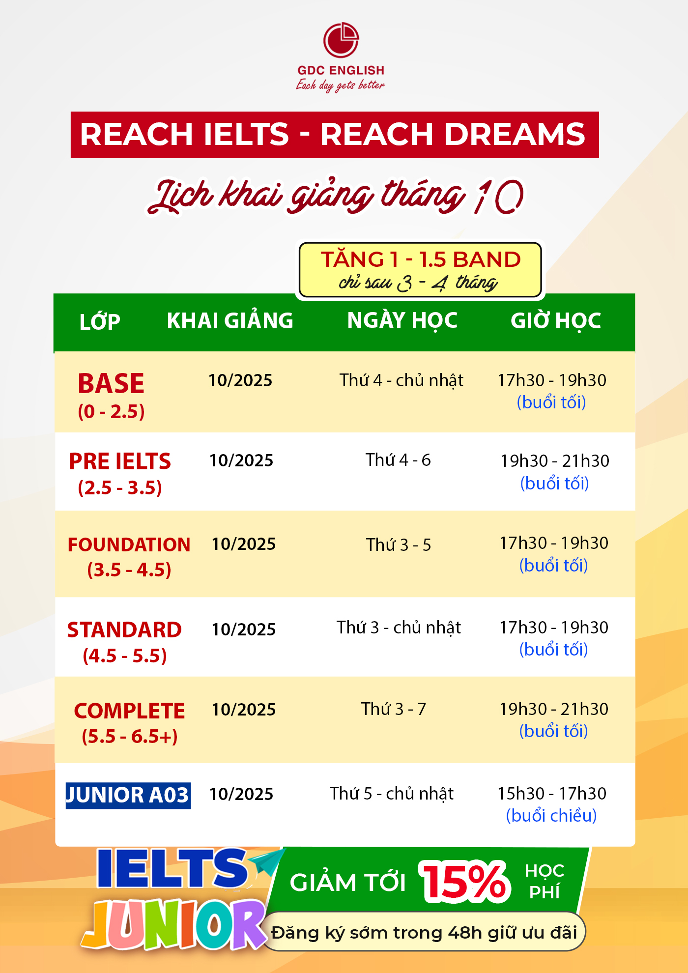 Hàng nghìn học viên GDC English đã tự tin giao tiếp Tiếng Anh, đạt 7.0+ IELTS và trúng tuyển vào các trường đại học top đầu. Bắt đầu sớm, thành công sớm, tương lai rộng mở.